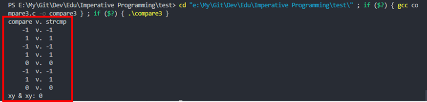 printf("%6d v. %2d\n", compare("xy", "xyz"), strcmp("xy", "xyz"));