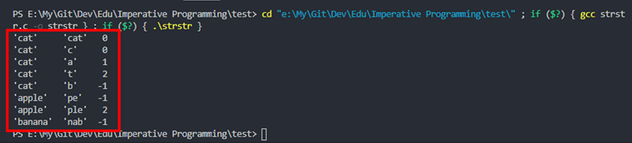 printf("'cat' 'cat' %2d\n", findString("cat","cat"));