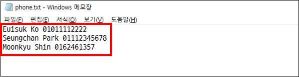 전화번호를 파일로부터 숫자로 인식할 경우 앞의 0을 생략한다.