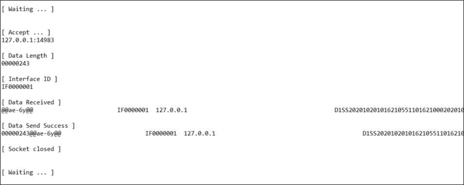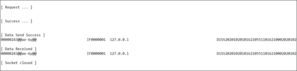 1 2 3 4 5 6 7 8 9 10 11 12 13 14 15 16 17 18 19 20 21 22 23 24 25 26 27 28 29 30 31 32 33 34 35 36 37 38 39 40 41 42 43 44 45 46 47 48 49 50 51 52 53 54 55 56 | import java.io.IOException; import java.io.InputStream; import java.io.OutputStream; import java.net.InetSocketAddress; import java.net.Socket; public class TcpClientExample { public static void main(String[] args) { Socket socket = null; try { socket = new Socket(); System.out.println("\n[ Request ... ]\n"); socket.connect(new InetSocketAddress("localhost", 9091)); System.out.println("\n[ Success ... ]\n"); byte[] bytes = null; String message = null; OutputStream os = socket.getOutputStream(); message = "00000243@@ae-6y@@ IF0000001 127.0.0.1 D1SS202010201016210551101621000202010201016210551UC AA00000058123 234 345 @@"; bytes = message.getBytes("UTF-8"); os.write(bytes); os.flush(); System.out.println("\n[ Data Send Success ]\n" + message); InputStream is = socket.getInputStream(); bytes = new byte[500]; int readByteCount = is.read(bytes); message = new String(bytes, 0, readByteCount, "UTF-8"); System.out.println("\n[ Data Received ]\n" + message); os.close(); is.close(); socket.close(); System.out.println("\n[ Socket closed ]\n"); } catch (Exception e) { e.printStackTrace(); } if (!socket.isClosed()) { try { socket.close(); System.out.println("\n[ Socket closed ]\n"); } catch (IOException e) { e.printStackTrace(); } } } } |