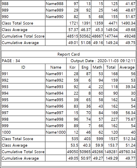 학생ID, 학생이름, 국어, 영어, 수학, 학생총점, 학생 평균