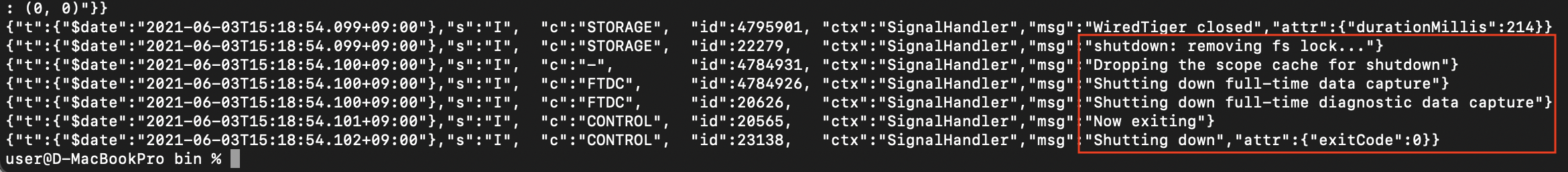 mongodb 기동 터미널 > ⌘+C > 종료