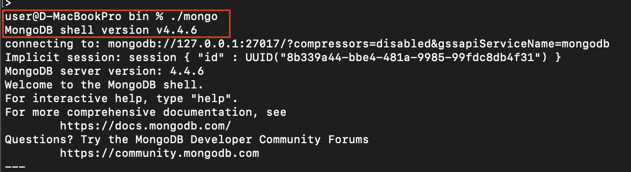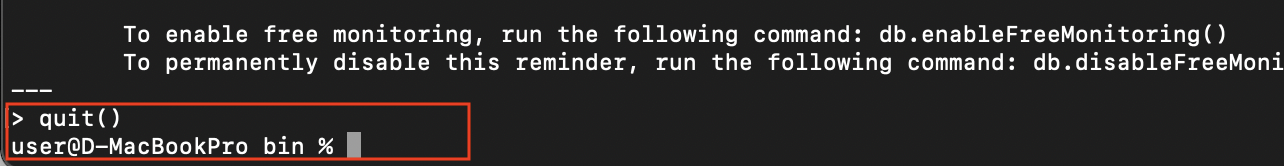 다른 터미널 > mongodb의 bin 폴더 > ./mongo 실행 확인 > quit() 으로 종료