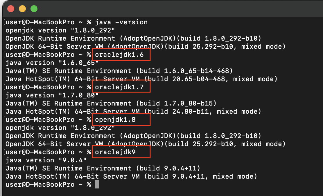 alias oraclejdk9='unset JAVA_HOME;export JAVA_HOME=$(/usr/libexec/java_home -v 9);java -version'