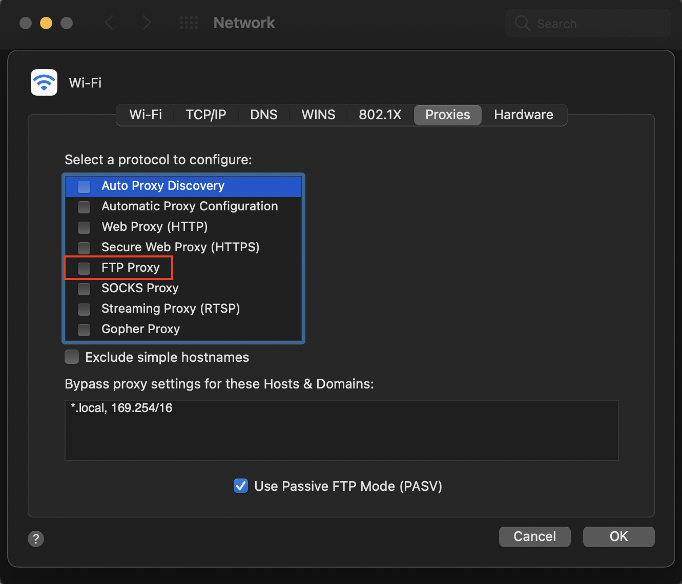 환경설정 (Settings) > Network > Proxies > FTP Proxy > 127.0.0.1 > 8888