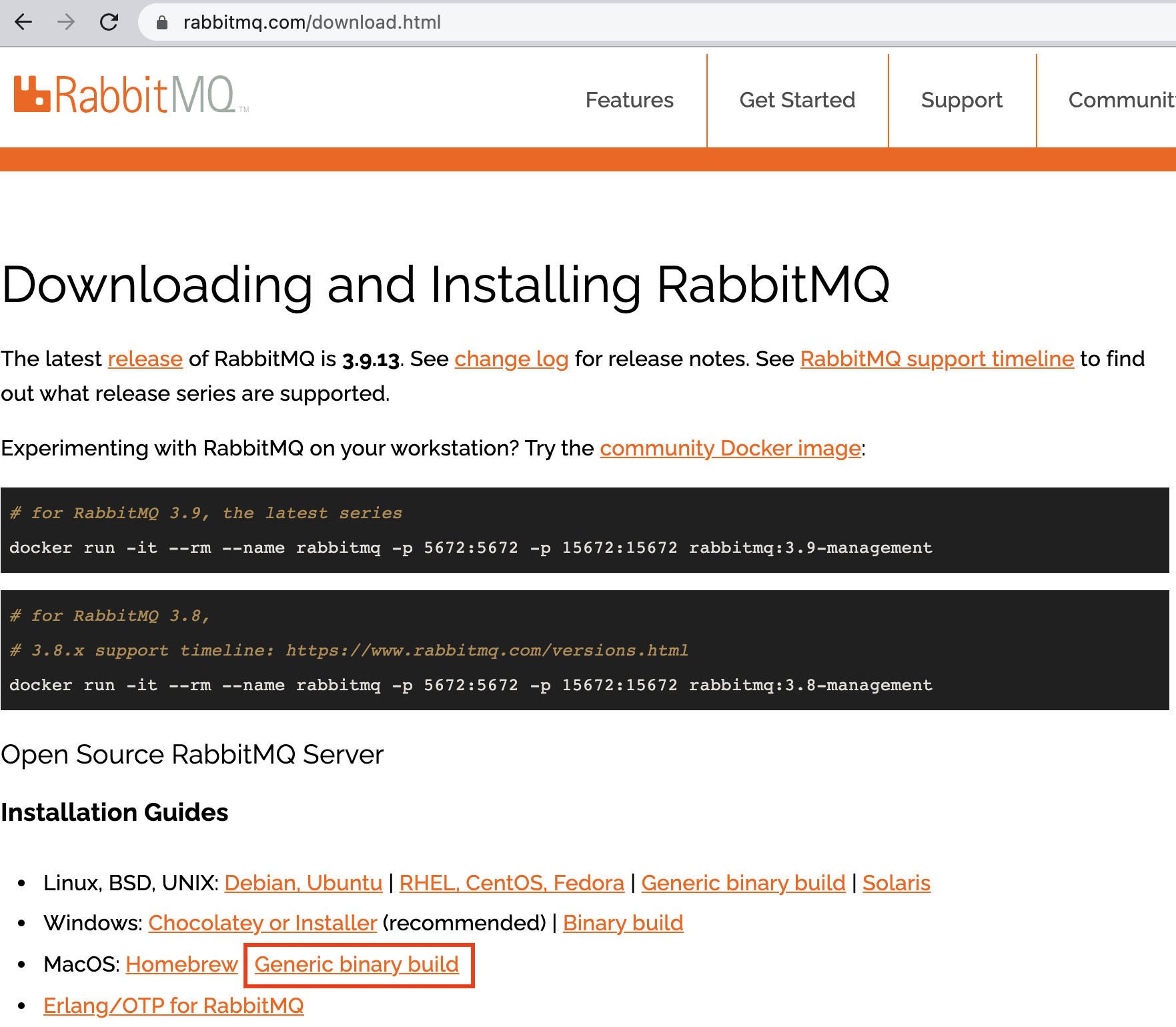 Downloading and Installing RabbitMQ The latest release of RabbitMQ is 3.9.13. See change log for release notes. See RabbitMQ support timeline to find out what release series are supported. Experimenting with RabbitMQ on your workstation? Try the community