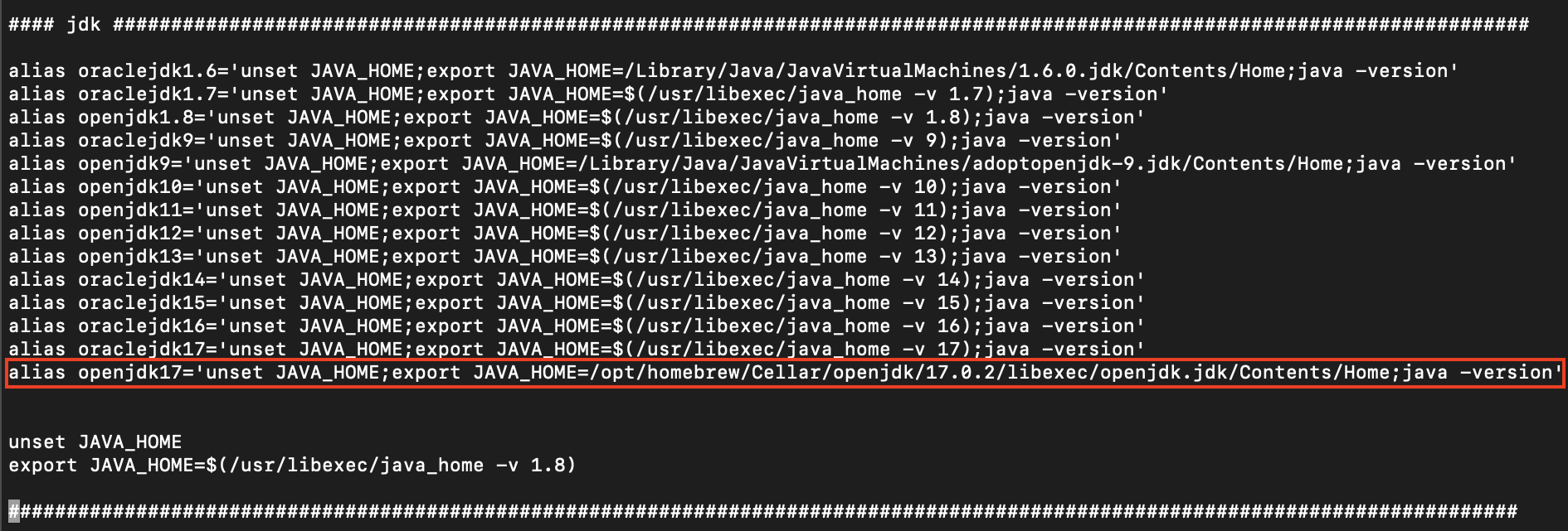 alias openjdk17='unset JAVA_HOME;export JAVA_HOME=/opt/homebrew/Cellar/openjdk/17.0.2/libexec/openjdk.jdk/Contents/Home;java -version'
