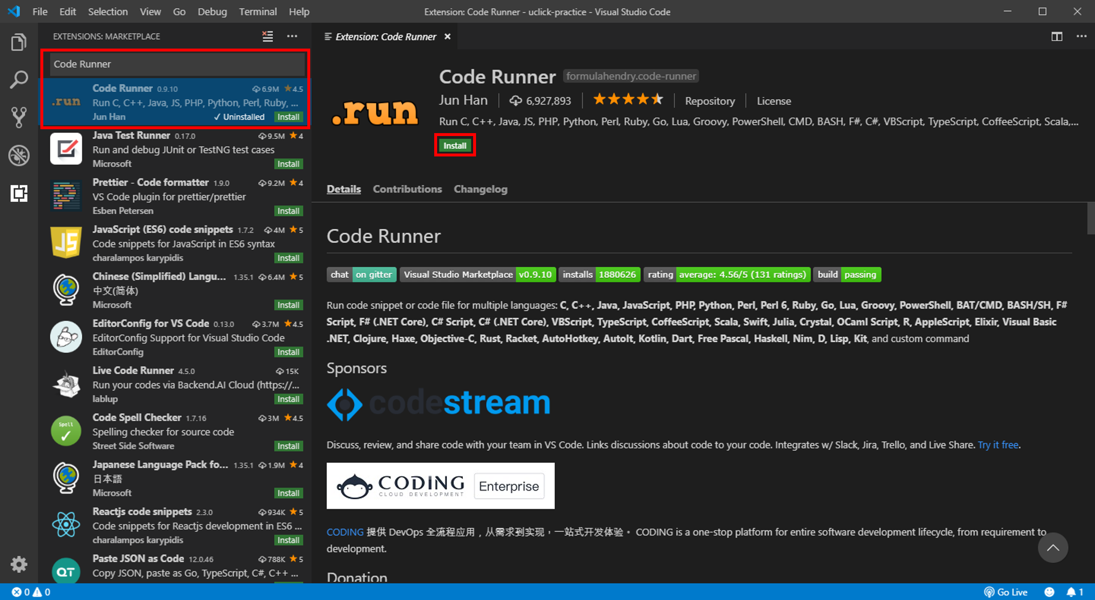 (2) 확장프로그램 (Code Runner) 선택 후 설치