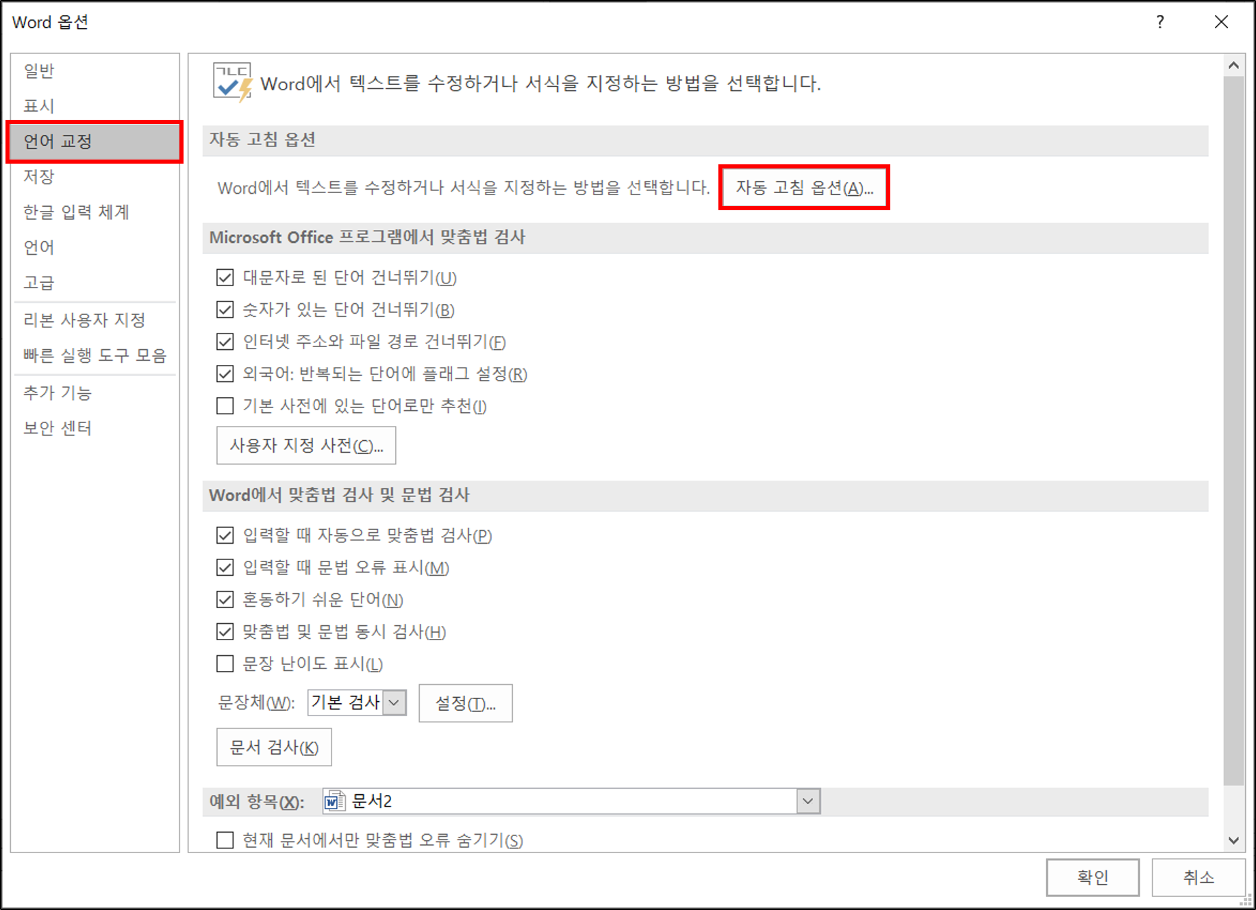 2. 옵션 → 언어교정 → 자동 고침 옵션